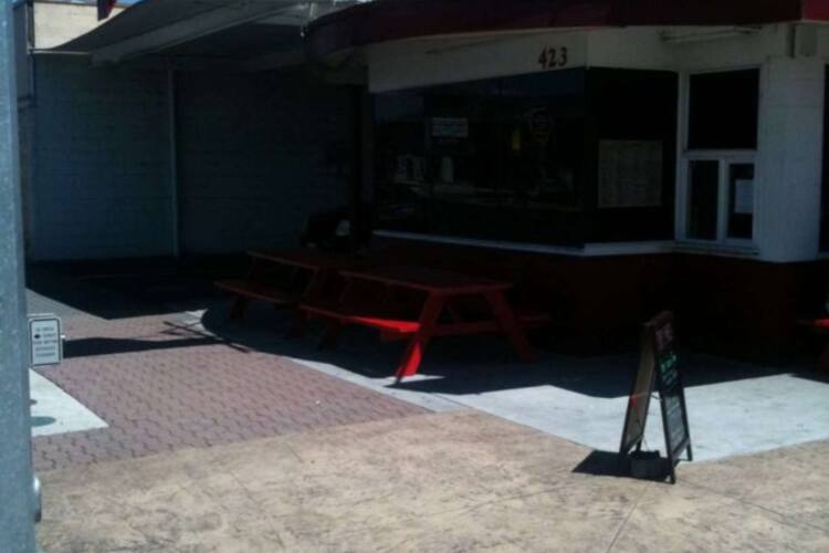 Drive-in with a few outdoor seats offering classic burgers fries milkshakes and sundaes.